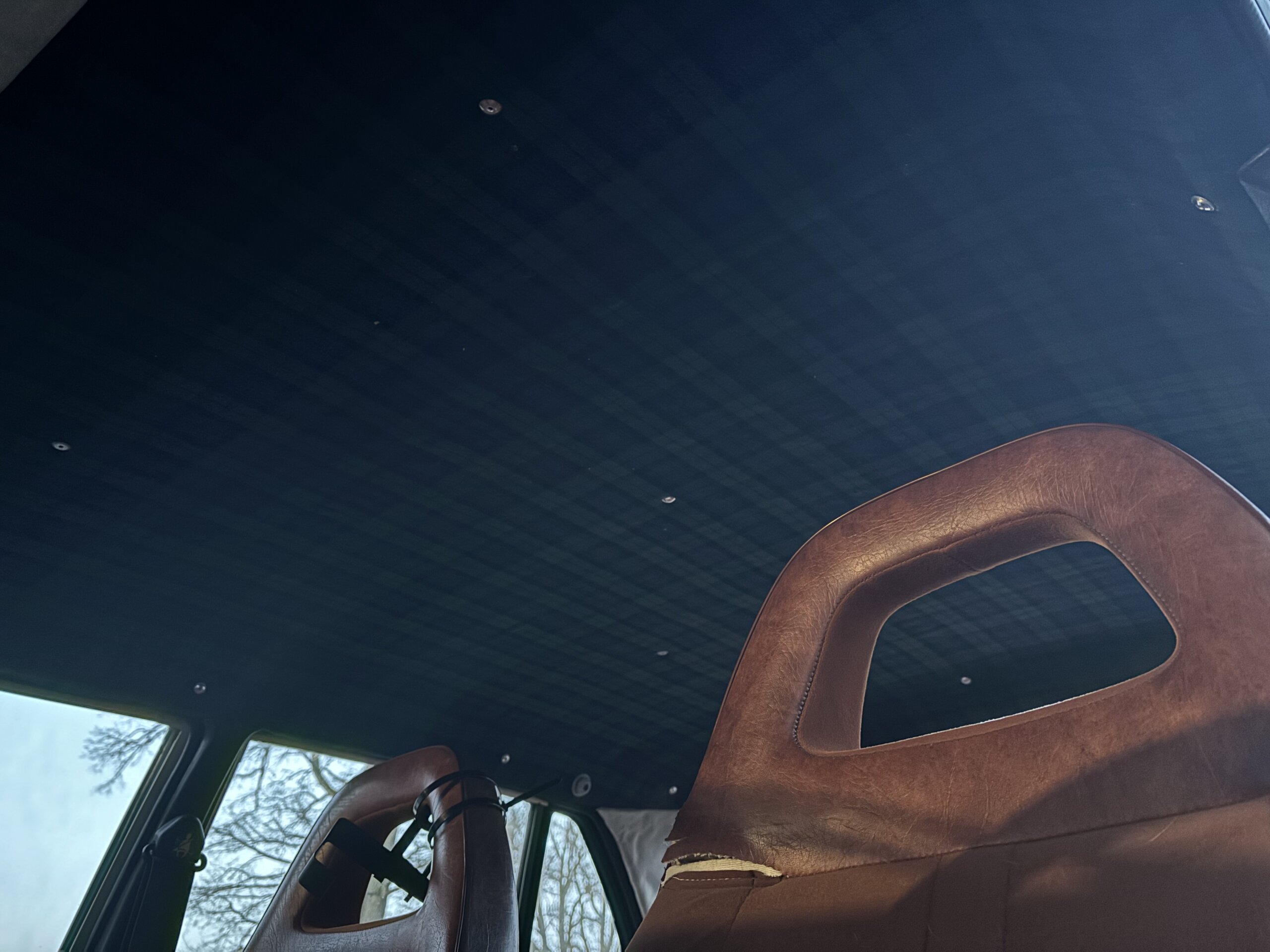 Klädde om innertaket med något Skotsk Blå/Grönt Tartan-gardintyg. Blev helt OK.