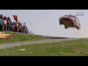 Rally car doing a massive jump in the WRC Rally Of Turkey. Testa pausa när han ...