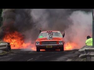 BLOWN V8 HOLDEN HQ ( KRANKY ) CATCHES FIRE IN THE BURNOUT FINALS AND LIGHTS UP ...