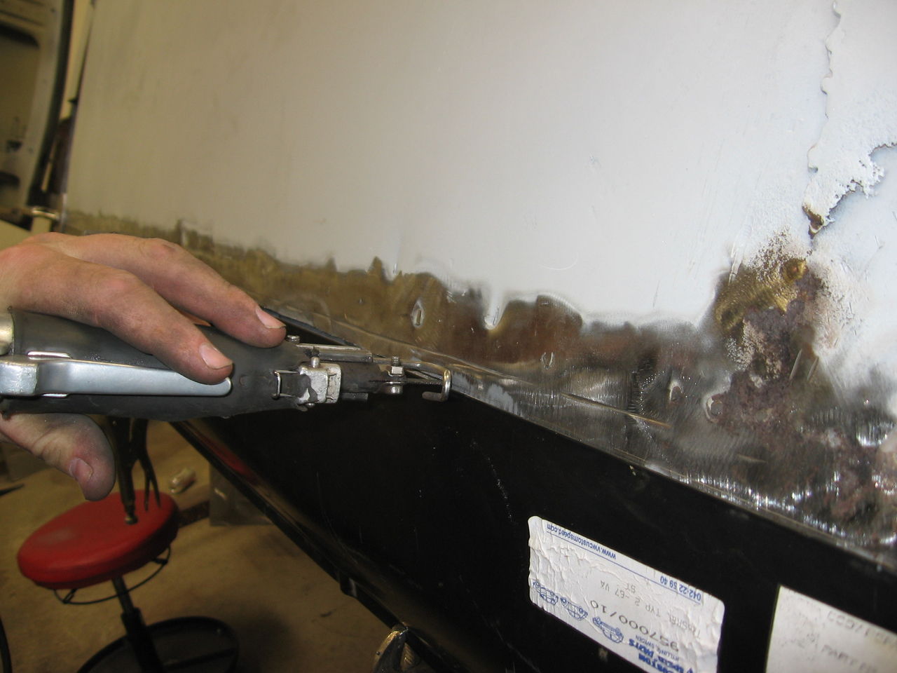 Kapar ur för tröskeln med sticksågen, blev riktigt bra då man får en springa på ca 1-2mm mellan nya tröskeln och gamla plåten. detta gör att risken är mindre att plåten ska "slåsig" vid svetsning.