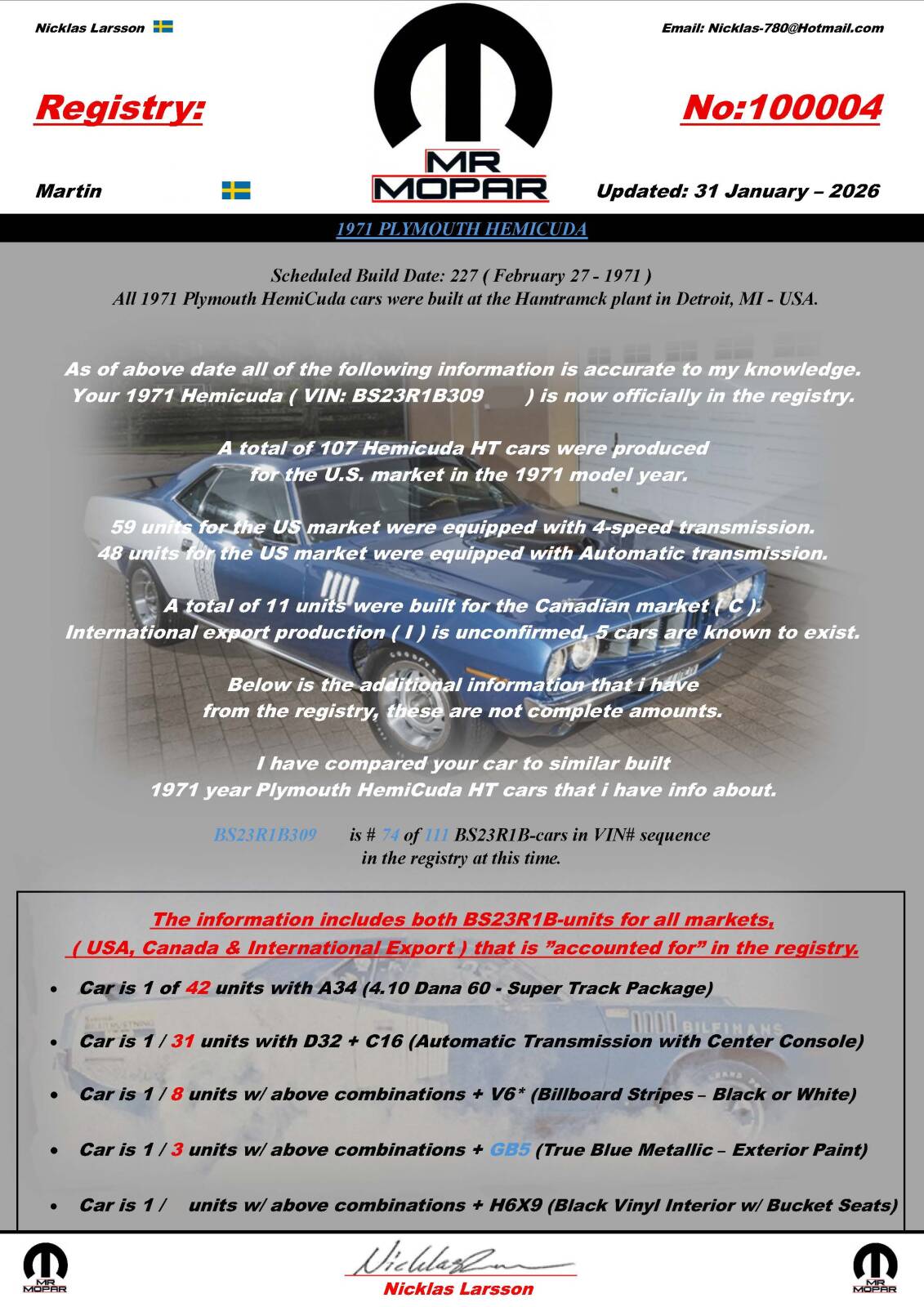 Mr Mopar Report & VIN Registry
