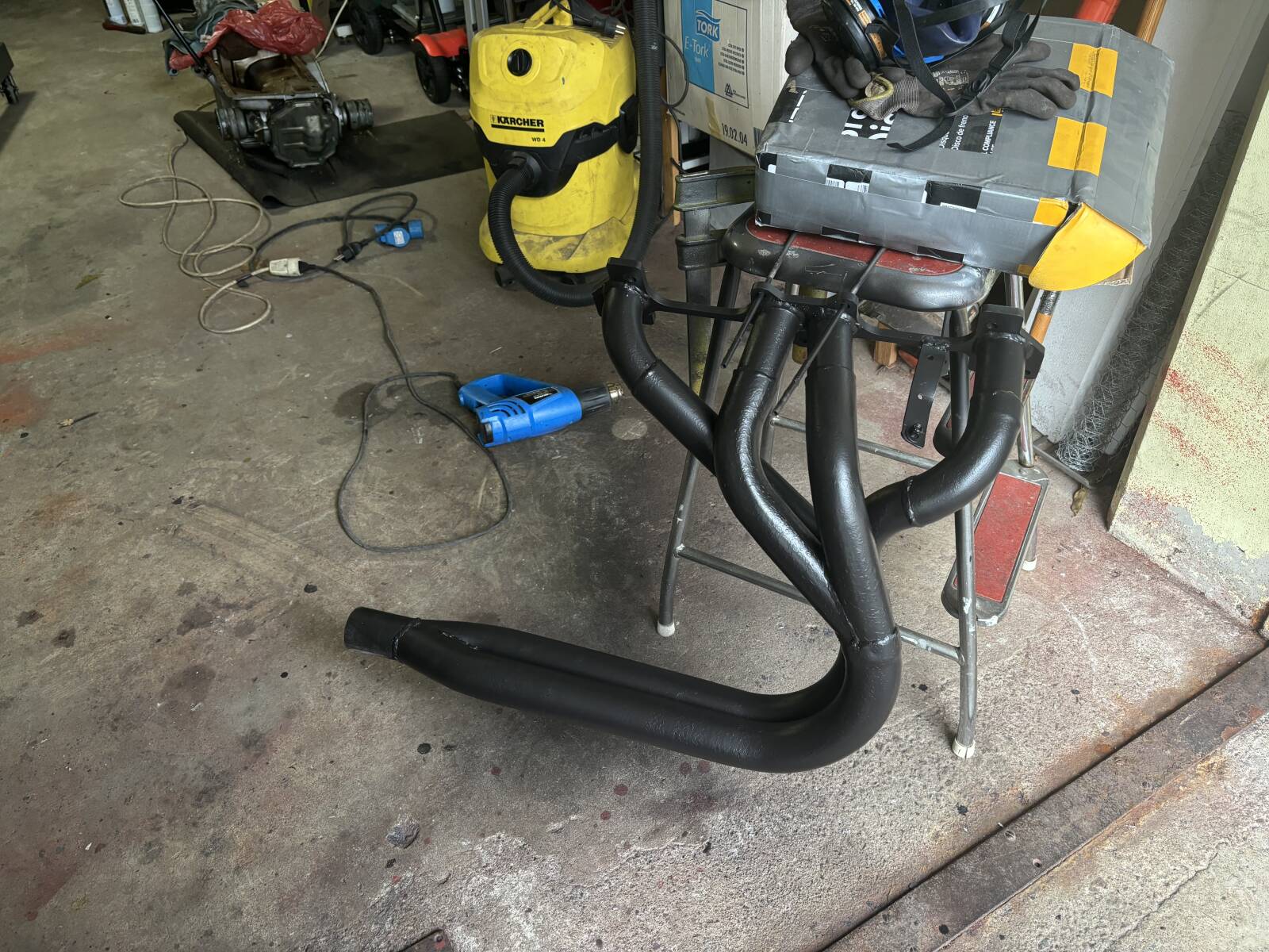 Insåg att avgasbandaget höll på att rosta upp extraktorn så blev att slipa och lacka med värmefärg.