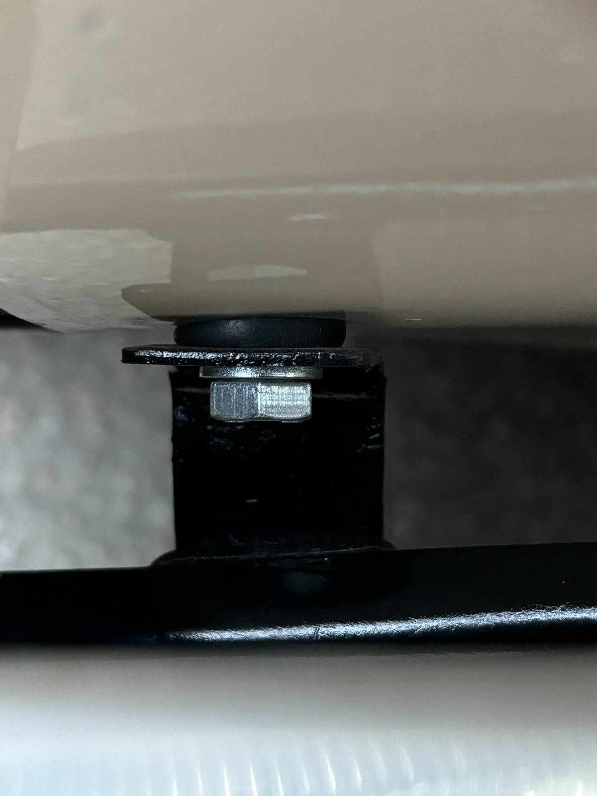 I framkant sitter den fast med original-hållarna, 2 rejäla fästen i stål. De har fått masseras lite för att passa mot karossen. I karossen borrade jag två stora hål där jag satte två grova kabelgenomföringar. Detta för att ge något mjukare montering och för att inte ha Metall mot Metall-kontakt.