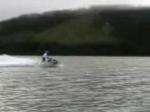 Det går till på följande sätt. Man är vid kanten ställer sig på skotern och så gasar man och styr ut i vattnet. Precis som på snön. Mattans kammar skottar undan vattnet det gör ju att man tar sig framåt.