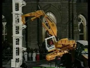 An excavator climbs on a specially made platform structure all the way to the ...
